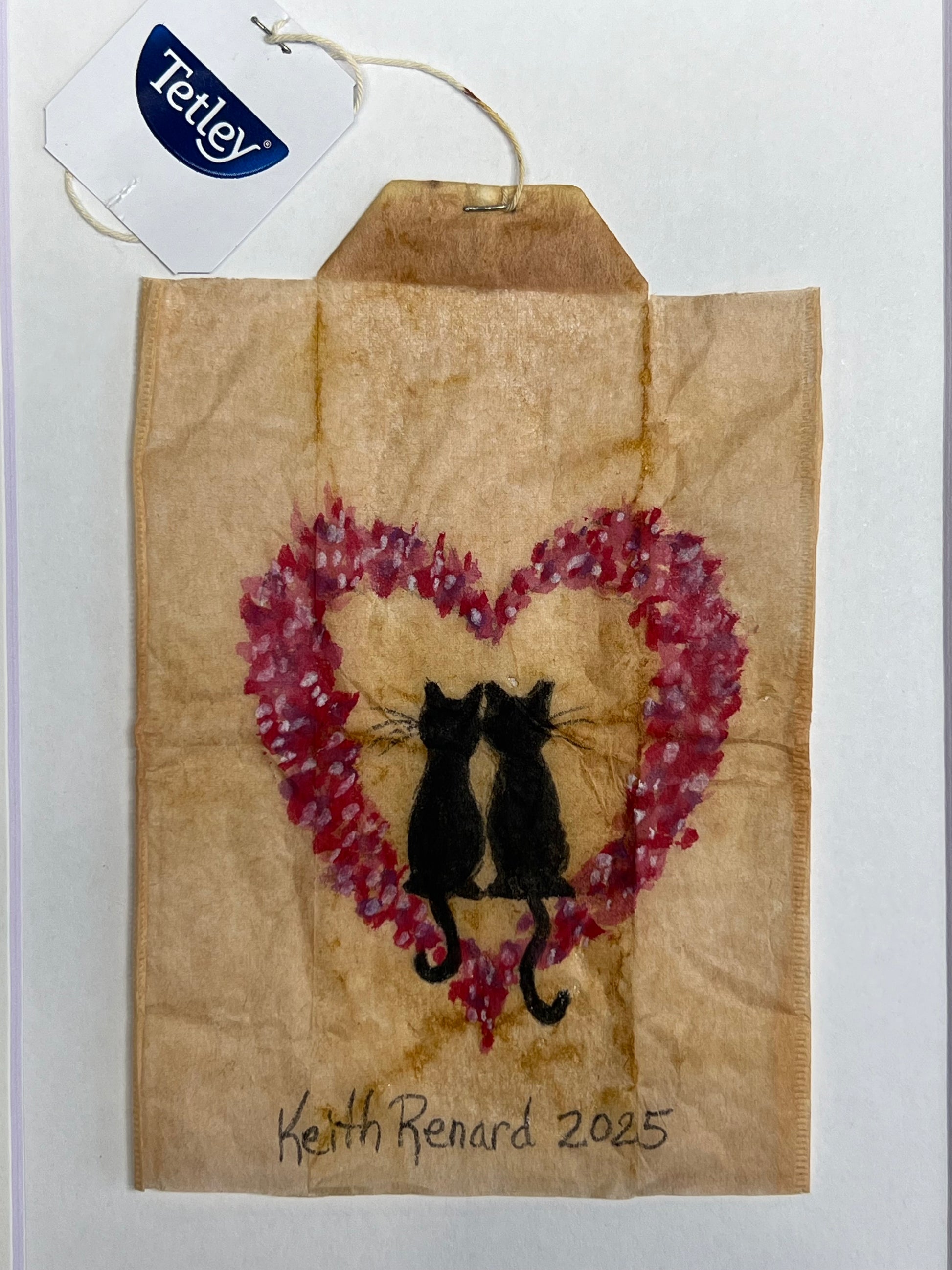 The artwork that is painted directly on to a recycled teabag that is opened up to approximately 3"x5" and is matted to fit an 8"x10" frame.